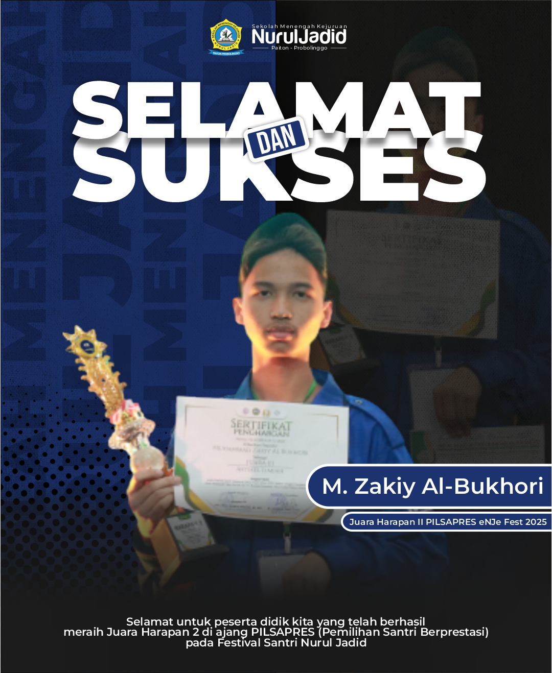 Rabu, 30 Desember 2025, SMK Nurul Jadid Paiton kembali mencatatkan prestasi melalui salah satu siswanya, M. Zakiy Al-Bukhori, yang berhasil meraih Juara Harapan II Pemilihan Santri Berprestasi (Pilsap...