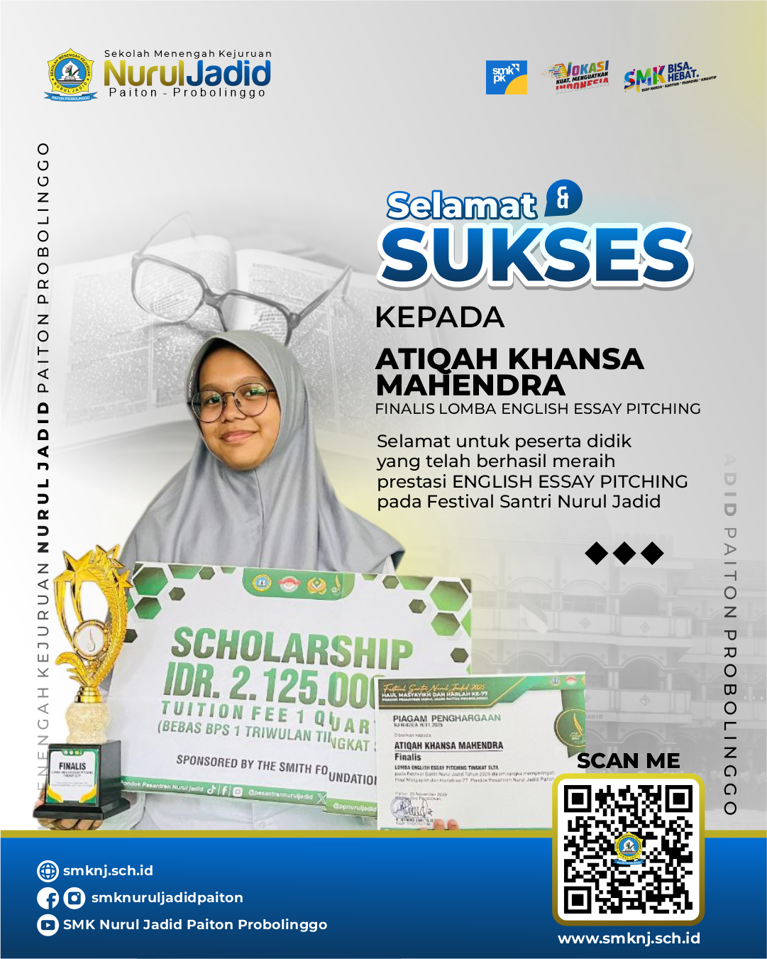 Paiton, Probolinggo — Rabu, 30 Desember 2025. SMK Nurul Jadid Paiton kembali menunjukkan kualitas peserta didiknya melalui capaian prestasi akademik yang diraih oleh Atiqah Khansa Mahendra. Siswi ter...